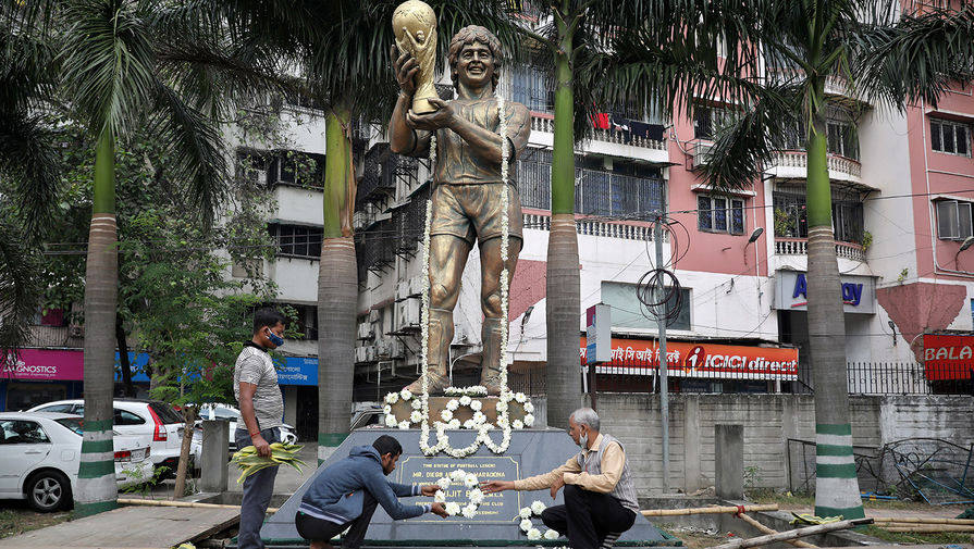 Статуя Диего Марадоны в Калькутте, Индия, 26 ноября 2020 года Футболка с фамилией Марадона на трибуне стадиона во время матча 4-го тура группового этапа Лиги чемпионов УЕФА сезона 2020/21 между ФК «Атлетико» (Испания, Мадрид) ФК «Локомотив» (Россия, Москва), 25 ноября 2020 года. Знаменитый футболист Диего Марадона скончался на 61-м году жизни за несколько часов до матча.
