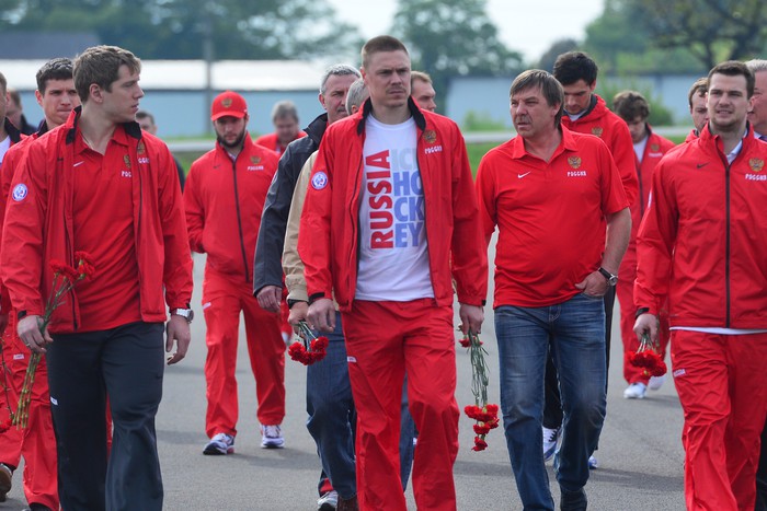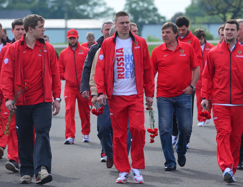Хоккеисты и тренерский штаб сборной России в преддверии матча группового этапа против Белоруссии возложили цветы к Национальному мемориалу в деревне Грабыне в Чехии.