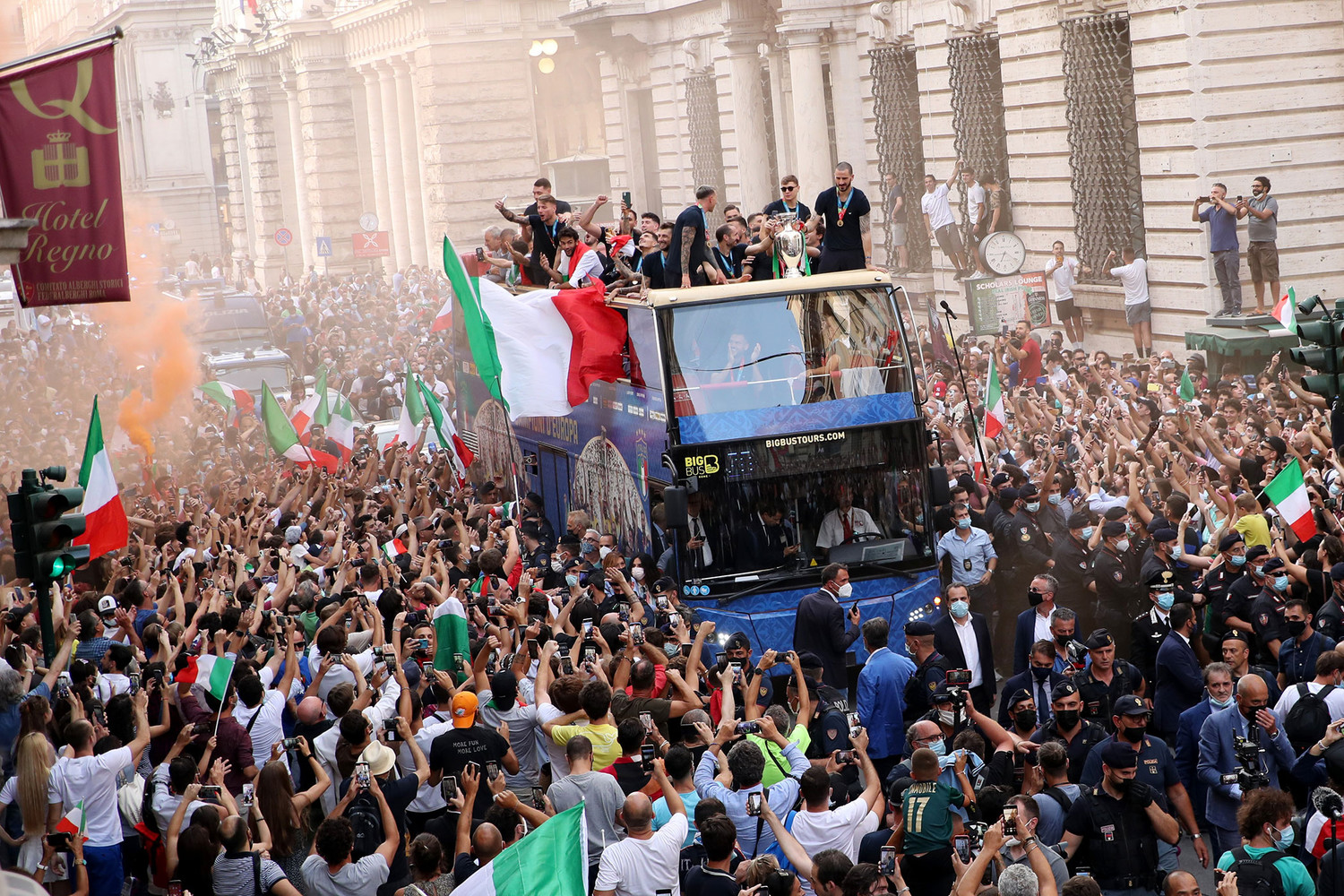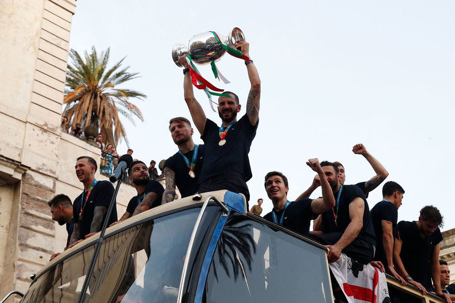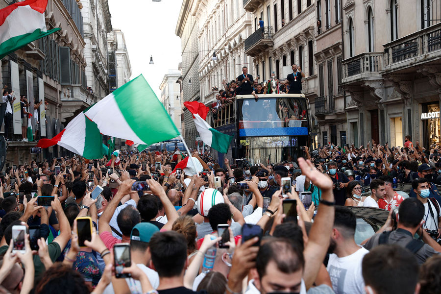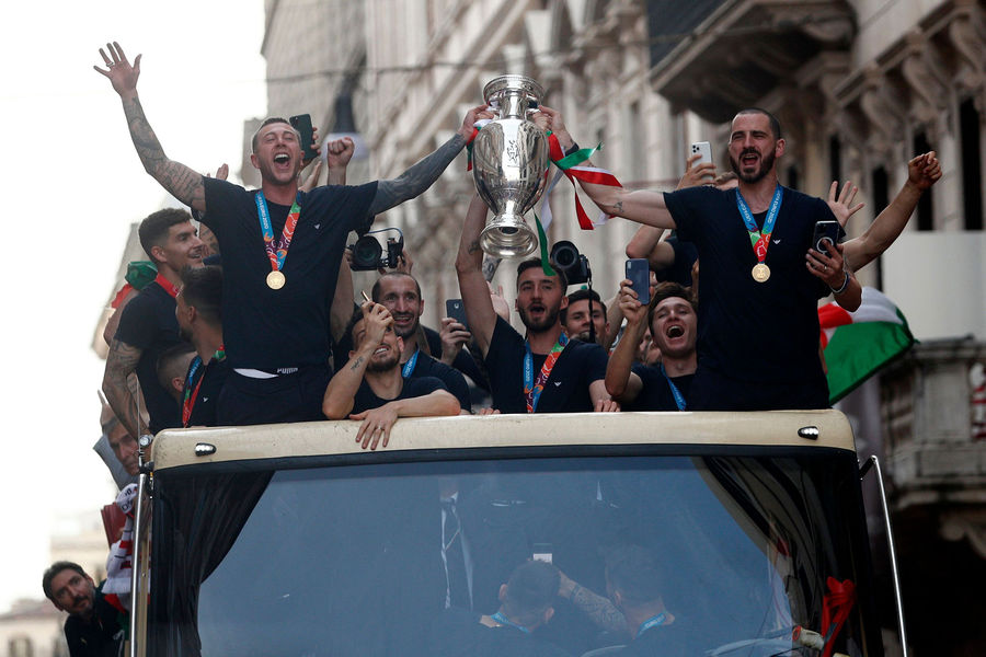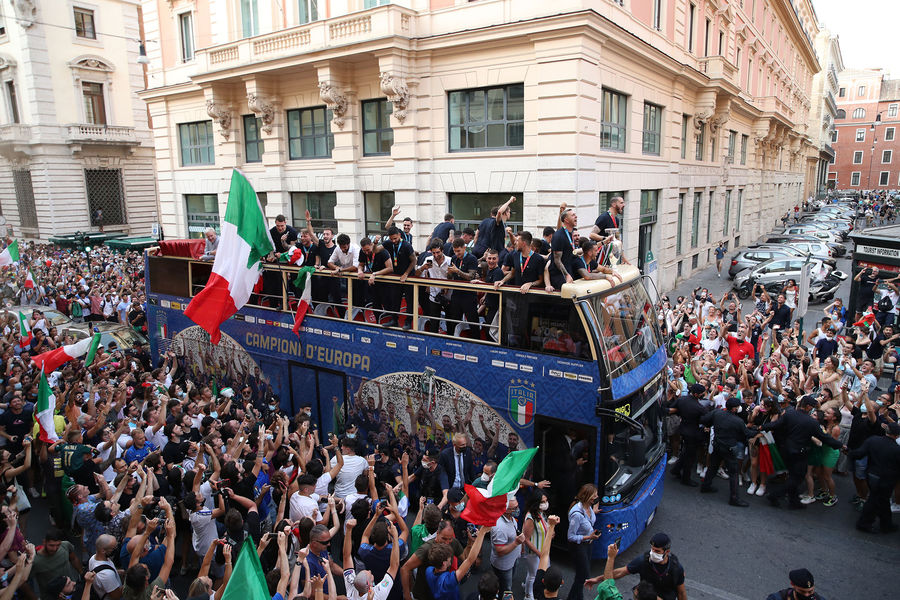 В Риме проходит чествование сборной Италии, которая выиграла чемпионат Европы-2020. Сначала с национальной командой встретились президент Италии Серджо Маттарелла и премьер-министр страны Марио Драги. После этого «скуадра адзурра» поехала на автобусе с кубком чемпионов Европы по улицам столицы, где их приветствовали тысячи болельщиков.