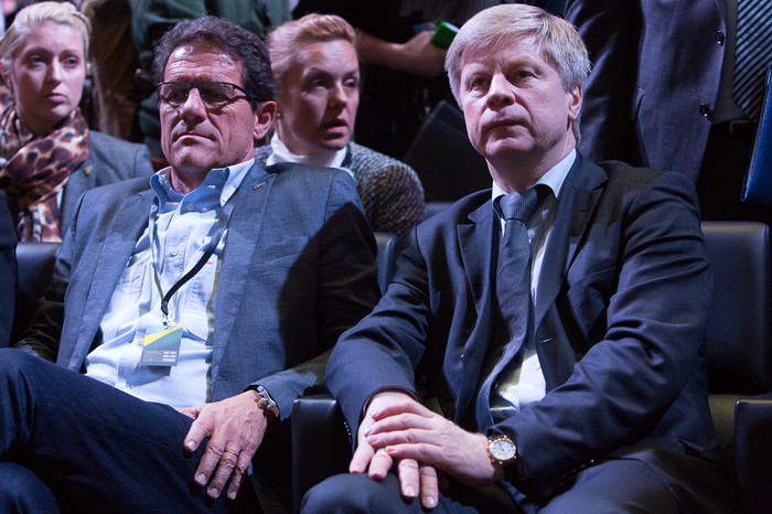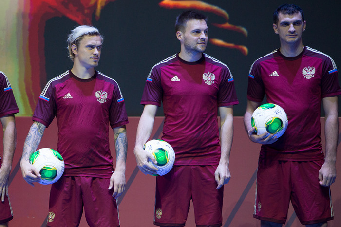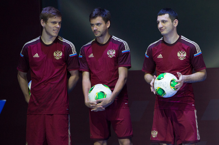 Новая форма сборной России Игроки сборной России (слева направо): Александр Самедов, Игорь Акинфеев, Денис Глушаков, Андрей Ещенко и Владимир Гранат Игроки сборной России: Сергей Игнашевич и Дмитрий Комбаров, а также футболист молодежной команды Алексей Миранчук и вратарь юношеской сборной Антон Митрюшкин. Новая форма сборной России. Игроки (слева направо): Александр Самедов, Игорь Акинфеев и Денис Глушаков Алан Дзагоев, Юрий Жирков, Алексей Ионов и Федор Смолов Игроки сборной России: Александр Кокорин, Георгий Щенников и Алан Дзагоев Андрей Ещенко, Владимир Гранат и Владимир Габулов Игроки сборной России по футболу Георгий Черданцев и Фабио Капелло, за спинами которых расположились футболисты сборной России Главный тренер сборной России Фабио Капелло и полузащитник Алан Дзагоев Новая линейка футбольных форм компании Adidas Ведущие церемонии Президент РФС Николай Толстых получает нашивку действующего чемпиона мира по пляжному футболу Новая форма сборной Аргентины Новая форма сборной Испании Новая форма сборной Германии Новая форма сборной Мексики Новая форма сборной Японии Главный тренер сборной России и президент РФС Николай Толстых