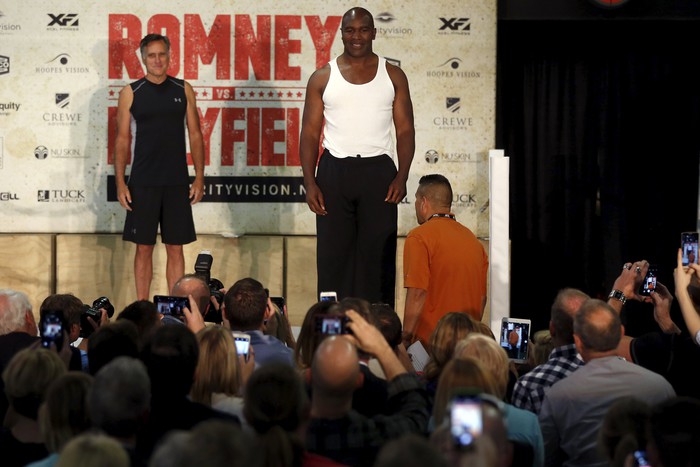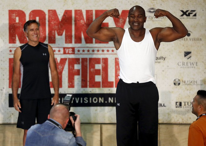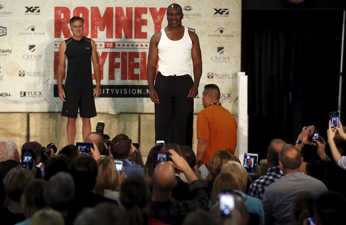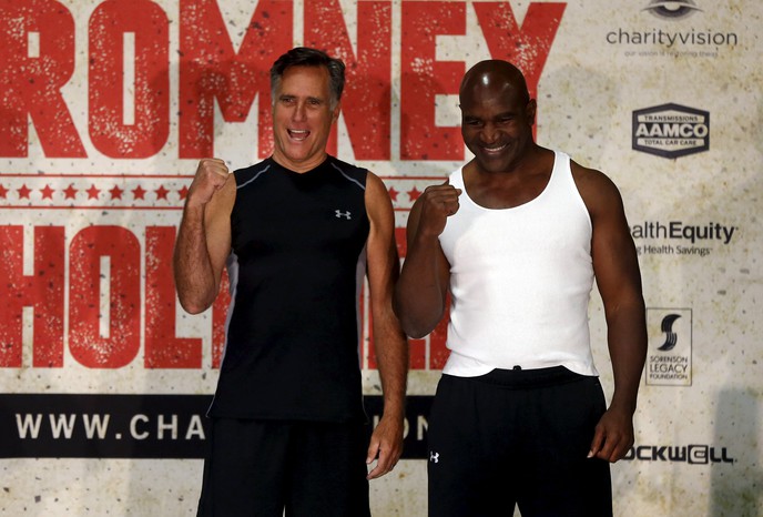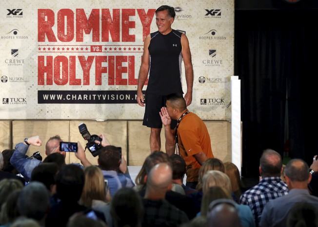 Экс-кандидат в президенты США и бывший губернатор штата Массачусетс 68-летний Митт Ромни и легендарный боксер 52-летний Эвандер Холифилд провели пресс-конференцию перед своим благотворительным поединком.
