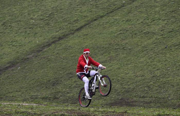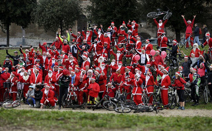 В Риме в воскресенье прошла необычная велогонка. Велосипедисты побили мировой рекорд по наибольшему количеству гонщиков, одетых в костюмы Санта-Клауса.