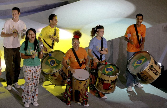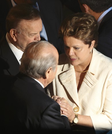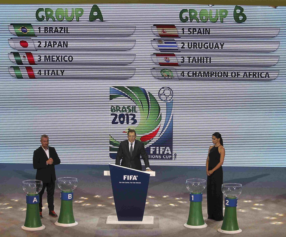 В группе А сыграют Бразилия, Япония, Мексика и Италия. В группе В: Испания, Уругвай, Таити и победитель Кубка африканских наций в январе следующего года Генеральный секретарь ФИФА вытащил листочек с чемпионом мира и двукратным чемпионом Европы командой Испании Панорама сцены, где проходила жеребьевка Двукратный чемпион мира Кафу с официальным мячом Кубка конфедераций под названием «Кафуса». Название мяча составлено из двух первых букв трех слов — карнавал, футбол и самба. Бразильская группа «Менинос до Марумби» выступает на жеребьевке Президент Бразилии Дилма Русефф и губернатор штата Рио-де-Жанейро Сержио Кабрал Генсек ФИФА Жером Вальке и Кафу Активисты рядом с местом, где проходит жеребьевка, вывесили плакат, в котором говорится «нет» преступности и насилию в Бразилии Президент ФИФА Зепп Блаттер выступает на жеребьевке Глава ФИФА Зепп Блаттер и президент Бразилии Дилма Русефф Главный тренер сборной Испании Висенте дель Боске на пресс-конференции после жеребьевки