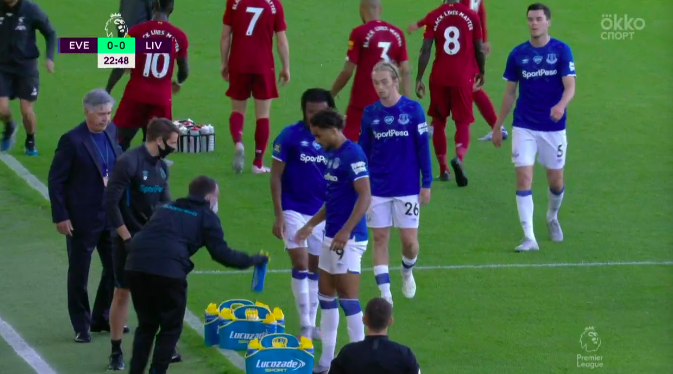 Мане потерял мяч на чужой половине поля, «Эвертон» тут же организовал длинный пас на Ришарлисона, тот протащил мяч до чужой штрафной, но скоростные игроки «Ливерпуля» уже вернулись и расставились. В итоге контратака превратилась в позиционную и завершилась очень плохим навесом Люки Диня — мяч вылетел за пределы поля.