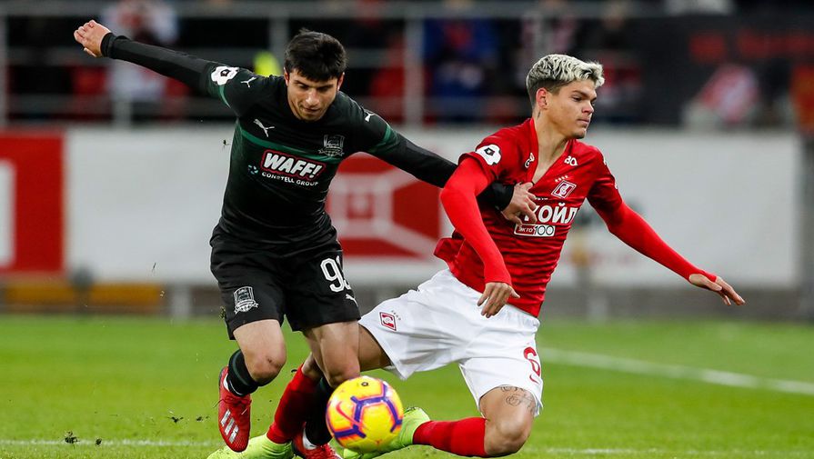 Игроки «Спартака» и «Краснодара» ведут борьбу за мяч