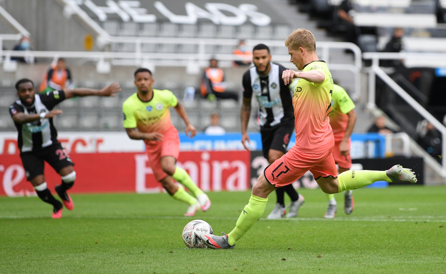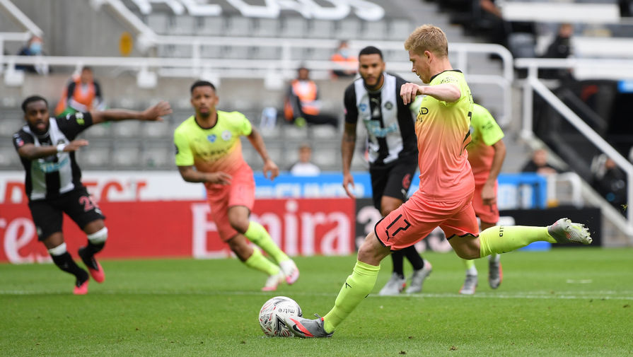 Теперь издали пробил Де Брёйне — заблокировали защитники «Ньюкасла» его выстрел.