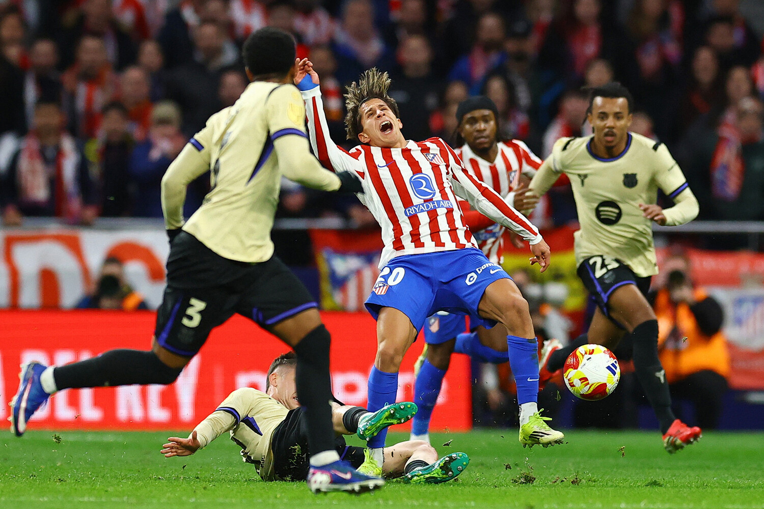 Кунде прострелил через штрафную «Атлетико», и его партнеры считали, что мяч задел руку кого-то из защитников, но нет.