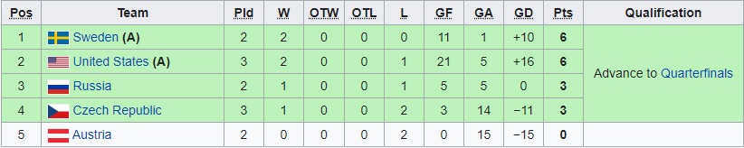 Важно выиграть с хорошим перевесом, поскольку при возможном равенстве набранных очков при распределении мест в группе разность заброшенных и пропущенных шайб будет иметь решающее значение. Сейчас у России — 0 (5-5). Вообще положение в группе выглядит следующим образом.