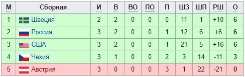 Сегодня сборная России завершит для себя групповой этап молодежного чемпионата мира, а в новогоднюю ночь в группе В состоятся еще поединки Чехия — Австрия и Швеция — США, которые окончательно и расставят всех по местам. В данный момент положение в группе таково.