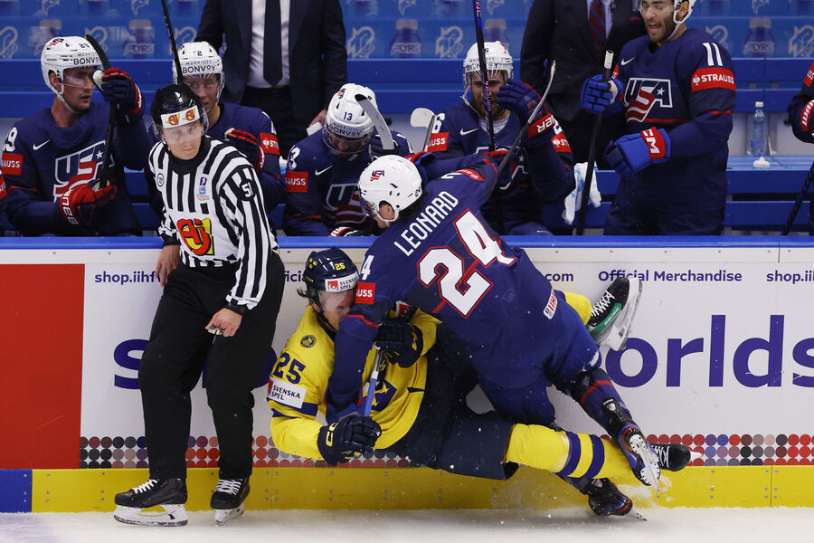 Тим Хед так пошел в борьбу против Леонарда, что аж потерял клюшку, сбив соперника — большинство у сборной США.