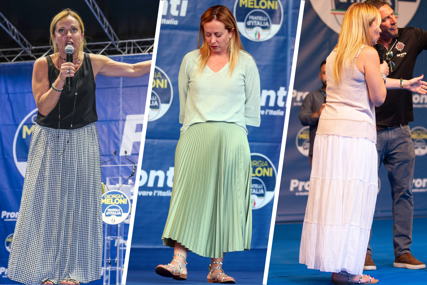Не стесняется лидер «Братьев Италии» и своей феминности: пока другие женщины-политики одеваются в костюмы, подражая коллегам противоположного пола, она носит юбки.