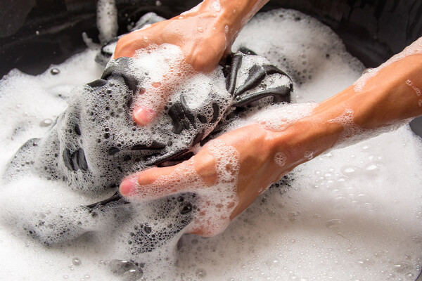 Промойте обработанное место загрязнения под холодной проточной водой, затем постирайте одежду в стиральной машине с использованием подходящего режима и стирального порошка в соответствии с рекомендациями на ярлыке изделия.