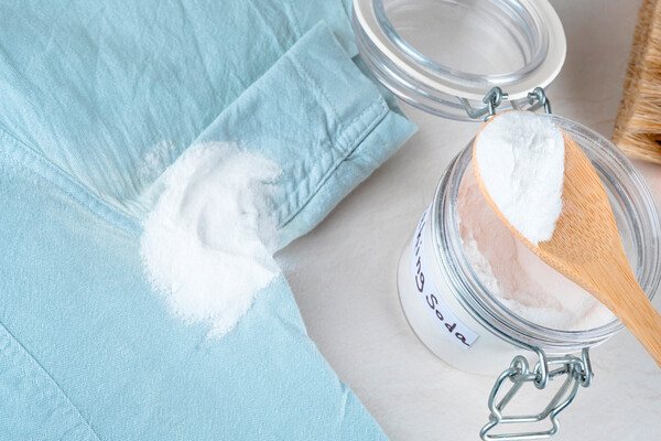 Пищевая сода (бикарбонат натрия) действует как абсорбент, поглощая жир из ткани. Она также слегка щелочная, что может помочь разрушить молекулы жира. Но ее стоит применять аккуратно, потому что она может испортить одежду. Посыпьте пятно пищевой содой, чтобы она покрыла всю область, и оставьте на 15–20 минут. Если пятно очень жирное, то можно подержать дольше. На этом этапе средство должно впитать жир. Далее смахните ее щеткой и нанесите пасту из соды с водой на пятно на 30 минут. Высохшую смесь нужно смыть и отправить вещь в стирку.