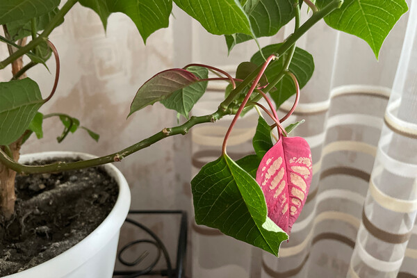 Совет: если пуансеттия растет слишком «худой» и высокой, главный стебель можно прищипнуть (отрезать часть верхушки с почкой), чтобы он начал формировать боковые побеги.