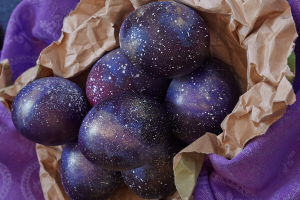 - При окрашивании периодически доставайте яйца из красящей смеси, протирайте салфеткой для «космического» эффекта и потом опускайте в другой цвет. Получатся красивые и разные, неповторимые «космические» рисунки.