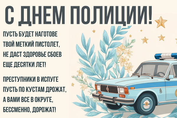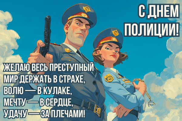 - С Днем сотрудника органов внутренних дел! Пусть работа спорится, руководители ценят, а семья встречает с улыбкой.