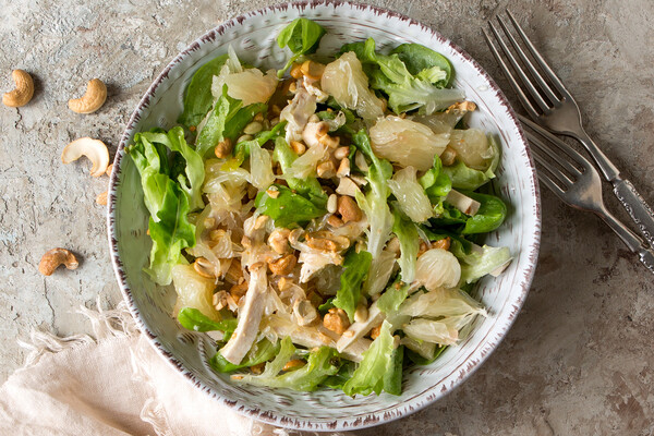 - В миске смешайте помело, креветки, салатный микс, черри и лук.