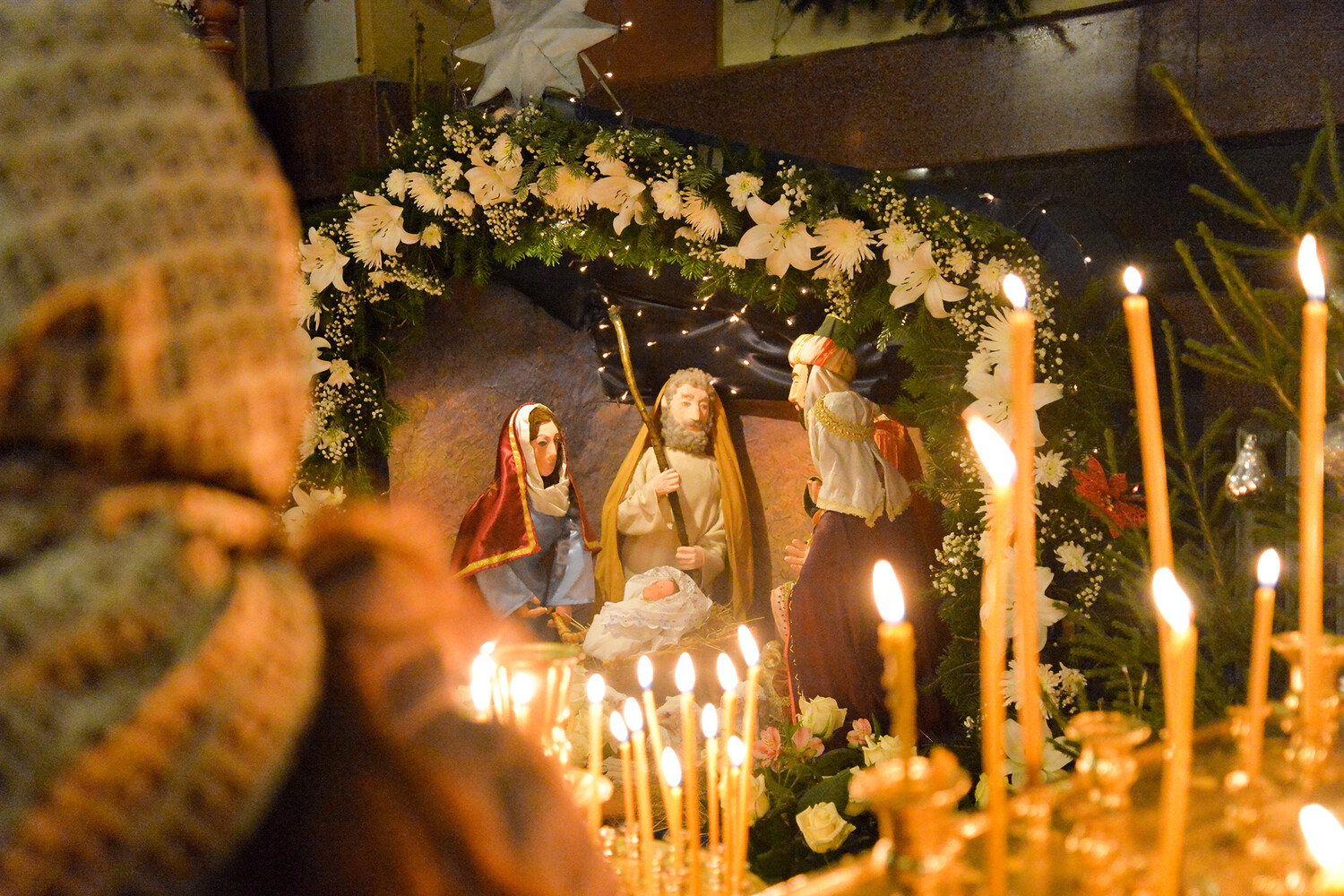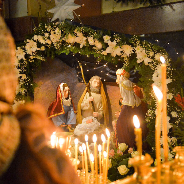 В этот момент пастухам, которые стерегли стадо у Вифлеема, Ангел возвестил о рождении Спасителя, и те поспешили поклониться Младенцу. А восточные мудрецы, волхвы, увидев яркую звезду на небосклоне, отправились в путь, догадавшись, что это особый знак прихода в мир Спасителя. Они поднесли Иисусу три дара: золото — символ царской власти, ладан — знак божественной природы, и смирну — ароматное масло, символизирующее его будущую смерть.