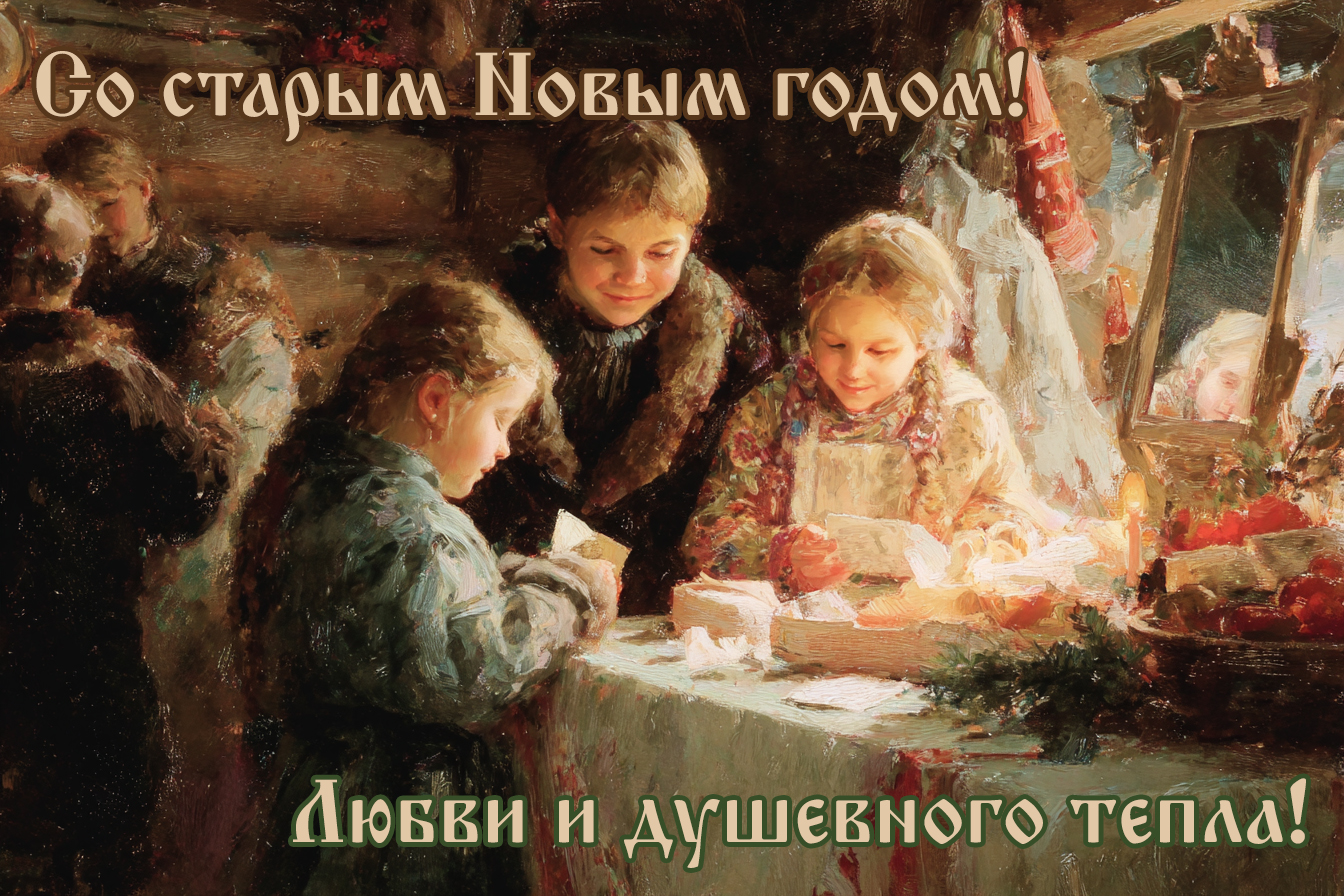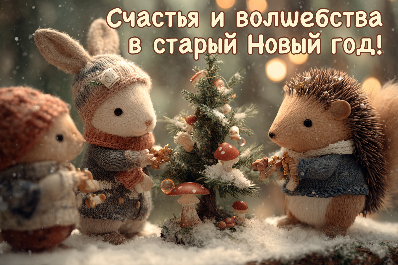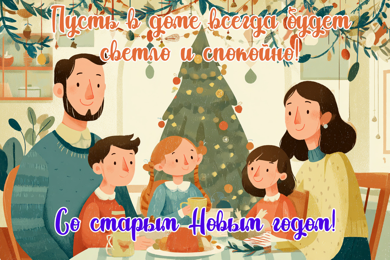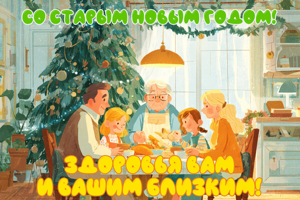 Поздравить родственников и знакомых со старым Новым годом можно красочной картинкой. Скачайте понравившуюся открытку на смартфон или компьютер и отправьте близким вам людям в мессенджере. Можно также разместить ее в соцсетях. Это отличный способ подарить праздничное настроение вашему окружению.