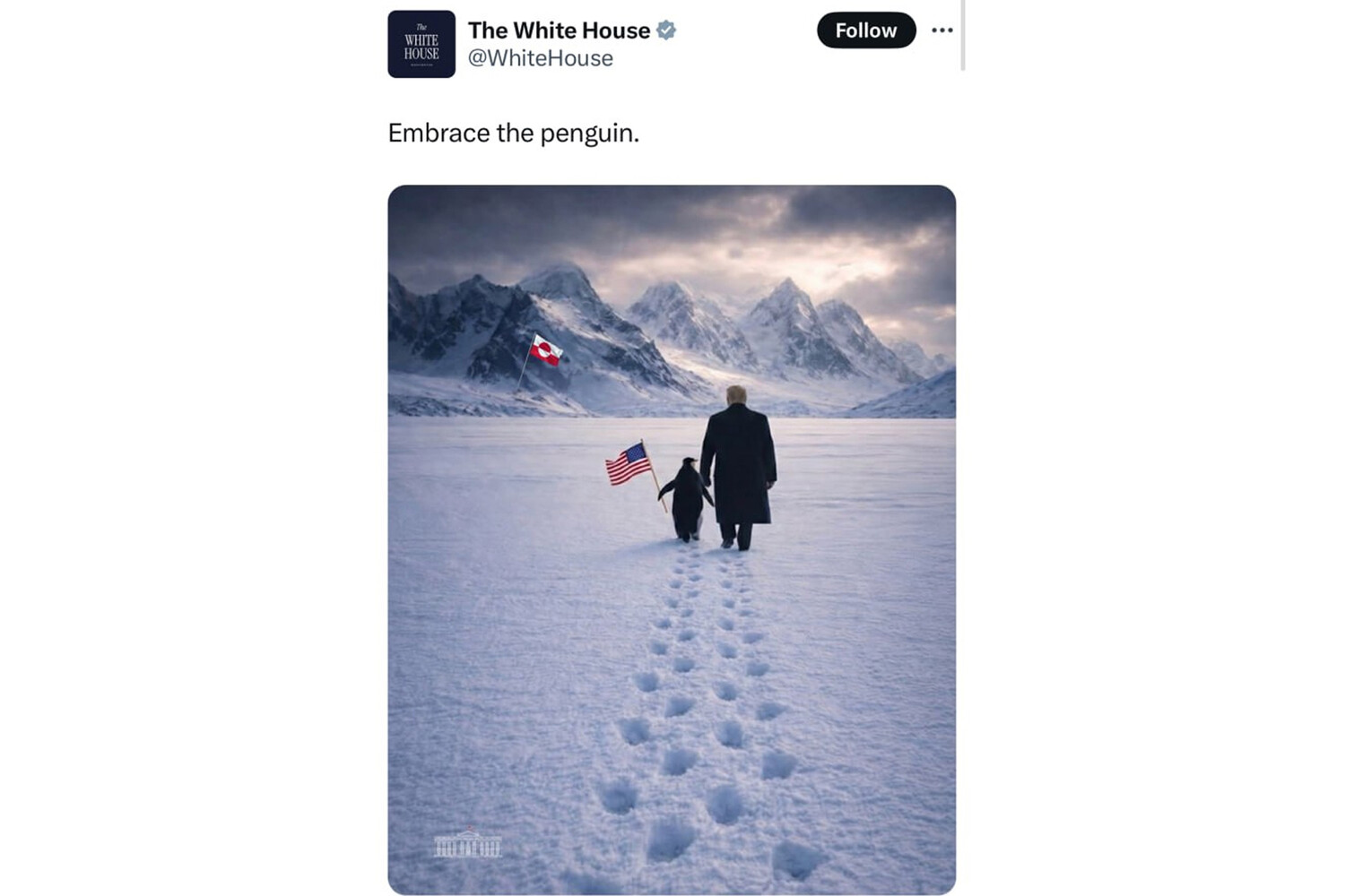 Белый дом даже попал в курьез, связанный с мемом. 24 января в соцсети X Белый дом опубликовал фотоколлаж, где пингвин идет к горе вместе с президентом США Дональдом Трампом. В лапе пингвин держит флаг США, а вдалеке виднеется флаг Гренландии. Публикация набрала 227 тысяч отметок «Мне нравится», ею поделились более 24 тысяч раз.
