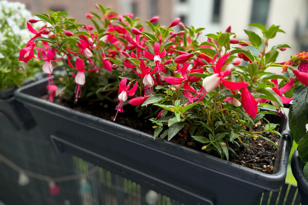 * Фуксии — одни из самых удобных растений для балкона. Они устойчивы к заморозкам, хорошо растут в рассеянном свете и при правильном уходе радуют цветением год за годом. Летом им комфортно при температуре от 18 до 25 ℃, а поливать их достаточно раз в 2–3 дня. Зимой фуксии погружаются в период покоя, поэтому их рекомендуется убирать в темное прохладное место (около 10 ℃).