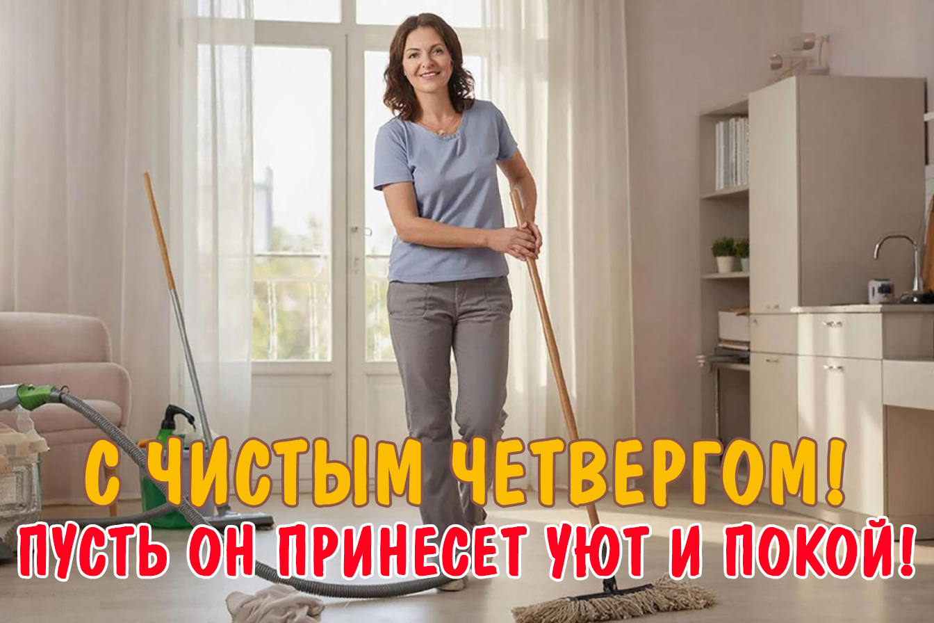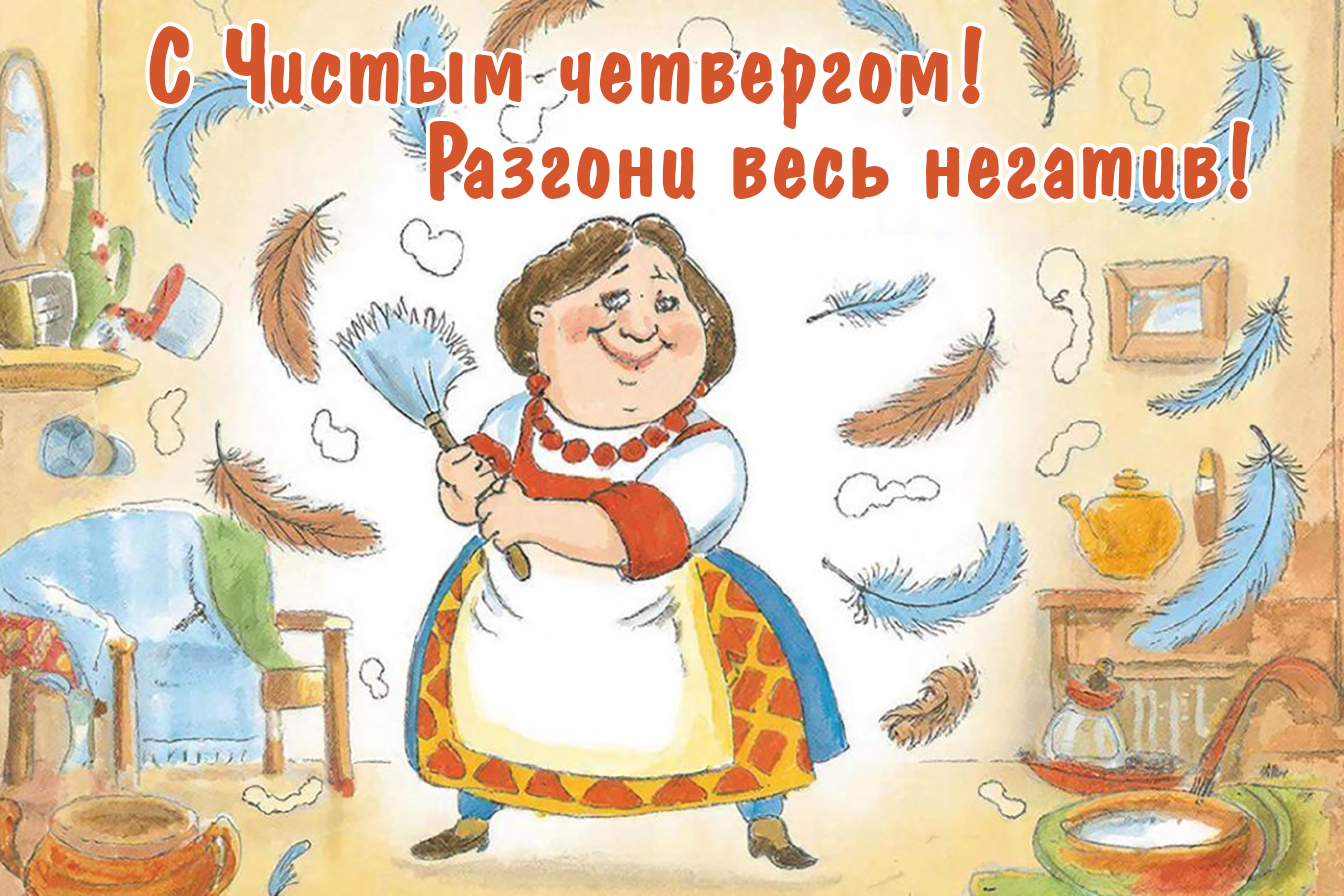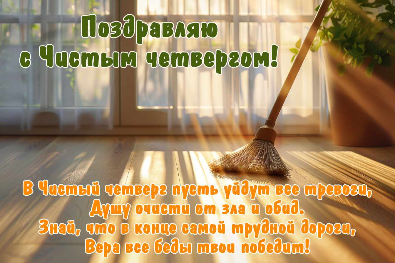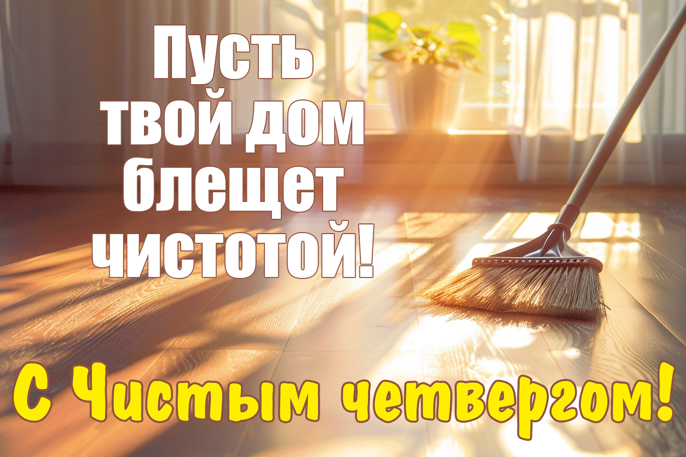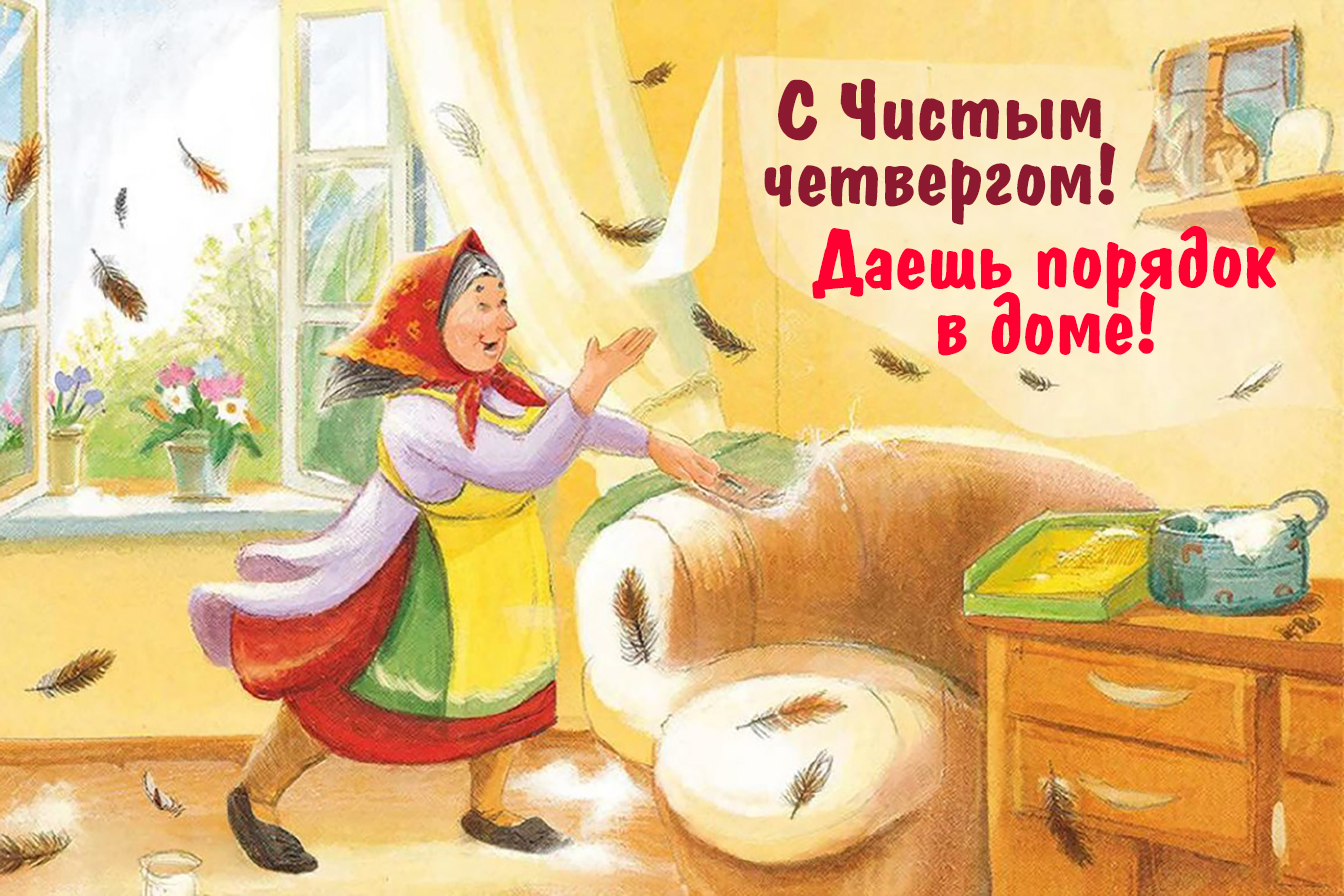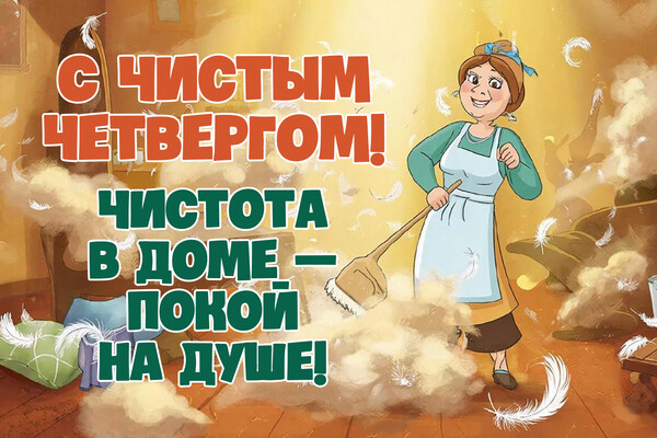 Чистый четверг — лишний повод напомнить о том, как важен порядок и уют в доме. Отправьте другу или близкому человеку нестандартную открытку с приятным пожеланием, чтобы мотивировать его на домашние дела.