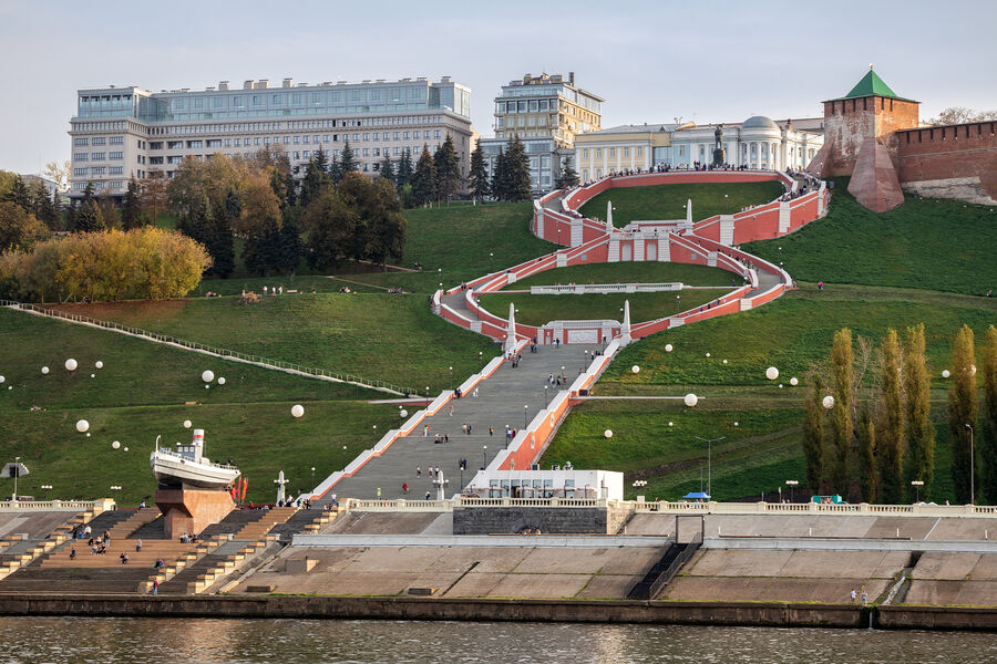 Визитная карточка Нижнего Новгорода. Монументальное сооружение соединяет Верхне-Волжскую и Нижне-Волжскую набережные. Проект лестницы был создан в 1943 году, а открытие состоялось в 1949-м. Изначально лестница называлась Волжской. Но со временем закрепилось ее народное название — Чкаловская, в честь летчика Валерия Чкалова — памятник ему расположен в верхней части лестницы.