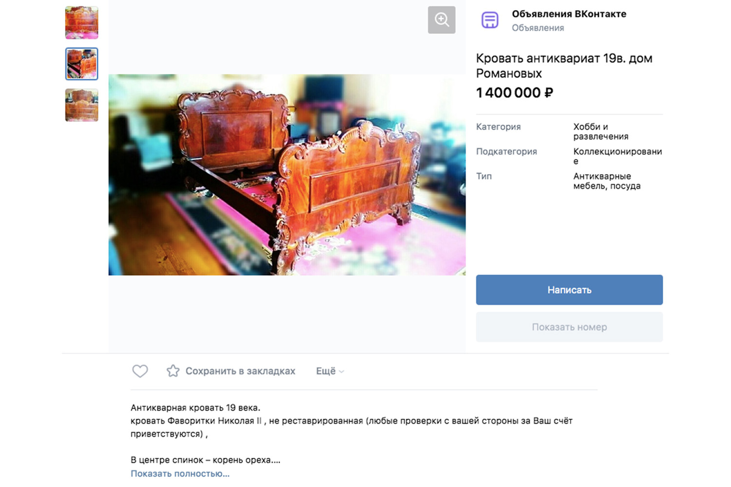 Жительница Москвы продает в «Объявлениях Вконтакте» антикварную кровать XIX века, которая, как утверждается в сообщении, принадлежала «фаворитке Николая II».