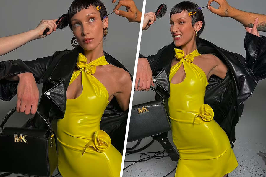 Для фотосессии модель нарядили в желтое мини-платье из латекса с декоративными бантами на шее и талии и дополнили его черной курткой-косухой с пышными рукавами, а также черными сапогами-ботфортами до середины бедра. На снимках Белла Хадид держит знаковую черную сумку американского дизайнера с золотыми инициалами MK и плетеной ручкой. Завершают образ Хадид крупные золотые серьги-конго.