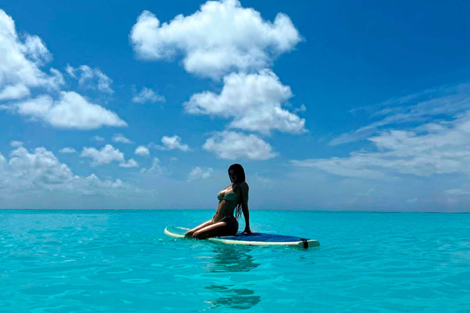24-летняя Кайли Дженнер опубликовала в личном блоге кадр с отдыха. На снимке звезда реалити-шоу и бизнесвумен предстала сидящей на доске для серфинга посреди океана. Она одета в раздельный купальник с треугольным лифом. «Счастливая девчонка», — подписала она.