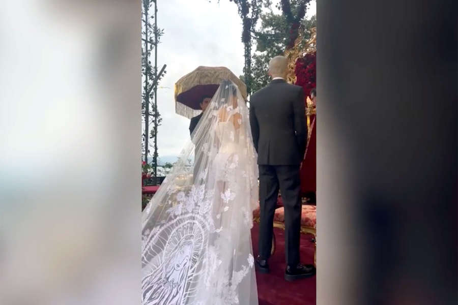 Невеста выбрала для свадьбы кружевное мини-платье, кремовые туфли на шпильке и чрезвычайно длинную полупрозрачную фату. Жених был в черном костюме с двубортным пиджаком, белой рубашке и галстуке-бабочке, тоже черного цвета.