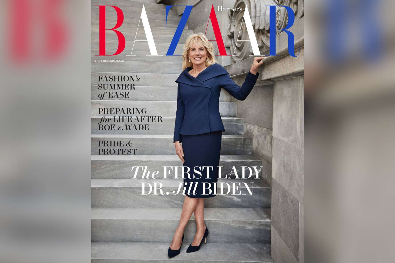 70-летняя Джилл Байден появилась на обложке Harper's Bazaar в темно-синем костюме, состоящем из жакета и юбки ниже колен, и туфлях-лодочках в тон. За время съемки первая леди США также сменила два платья: белоснежное с геометричной линией декольте и рюшами, а также насыщенное фиолетовое с бусинами на рукавах.