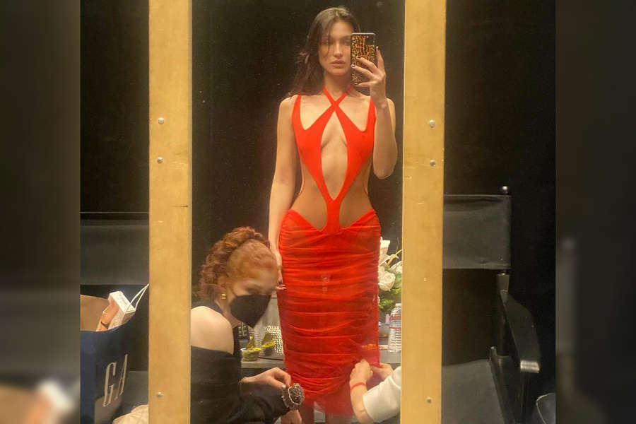 Белла Хадид выложила в личном блоге фотографию, на которой предстала в нашумевшем платье от французского модного Дома Mugler. Благодаря разрезам в верхней части и полупрозрачному подолу, оно подчеркнуло фигуру супермодели, частично обнажив зону декольте, талию и спину.