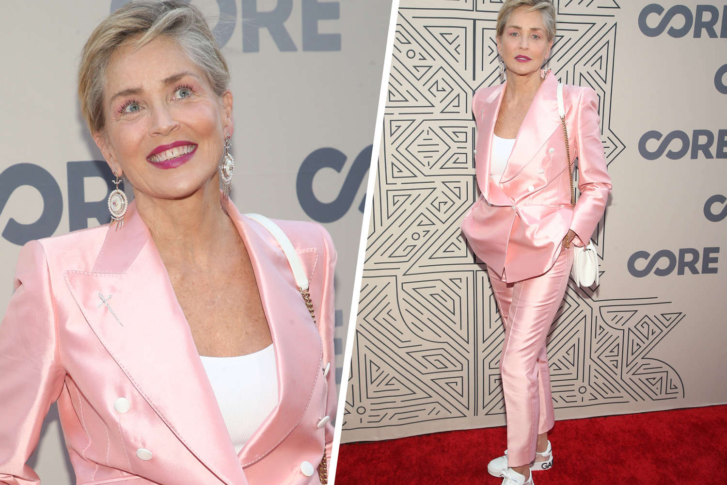 64-летняя звезда «Основного инстинкта» появилась на красной ковровой дорожке в атласном брючном костюме розового цвета, который надела с белой майкой и кедами. Образ Шэрон Стоун дополнили крупные серьги, сумка на цепочке Dolce&Gabbana, а также яркий макияж с тенями в тон наряду и помадой оттенка фуксии.