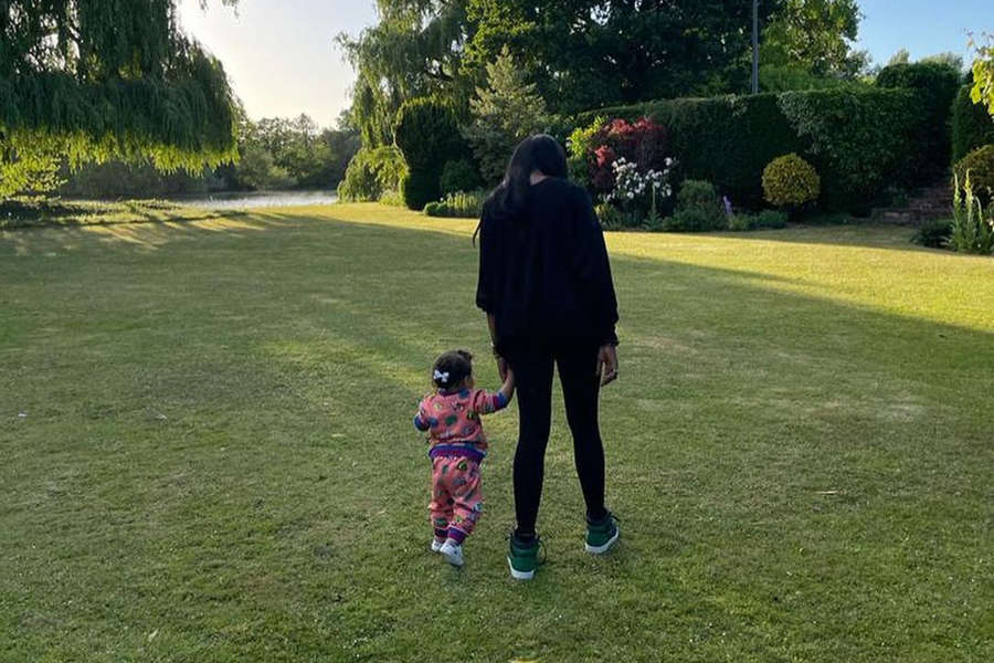 На днях супермодель поделилась с подписчиками фотографией, на которой она прогуливается по парку перед озером, держа за руку идущую рядом дочь.