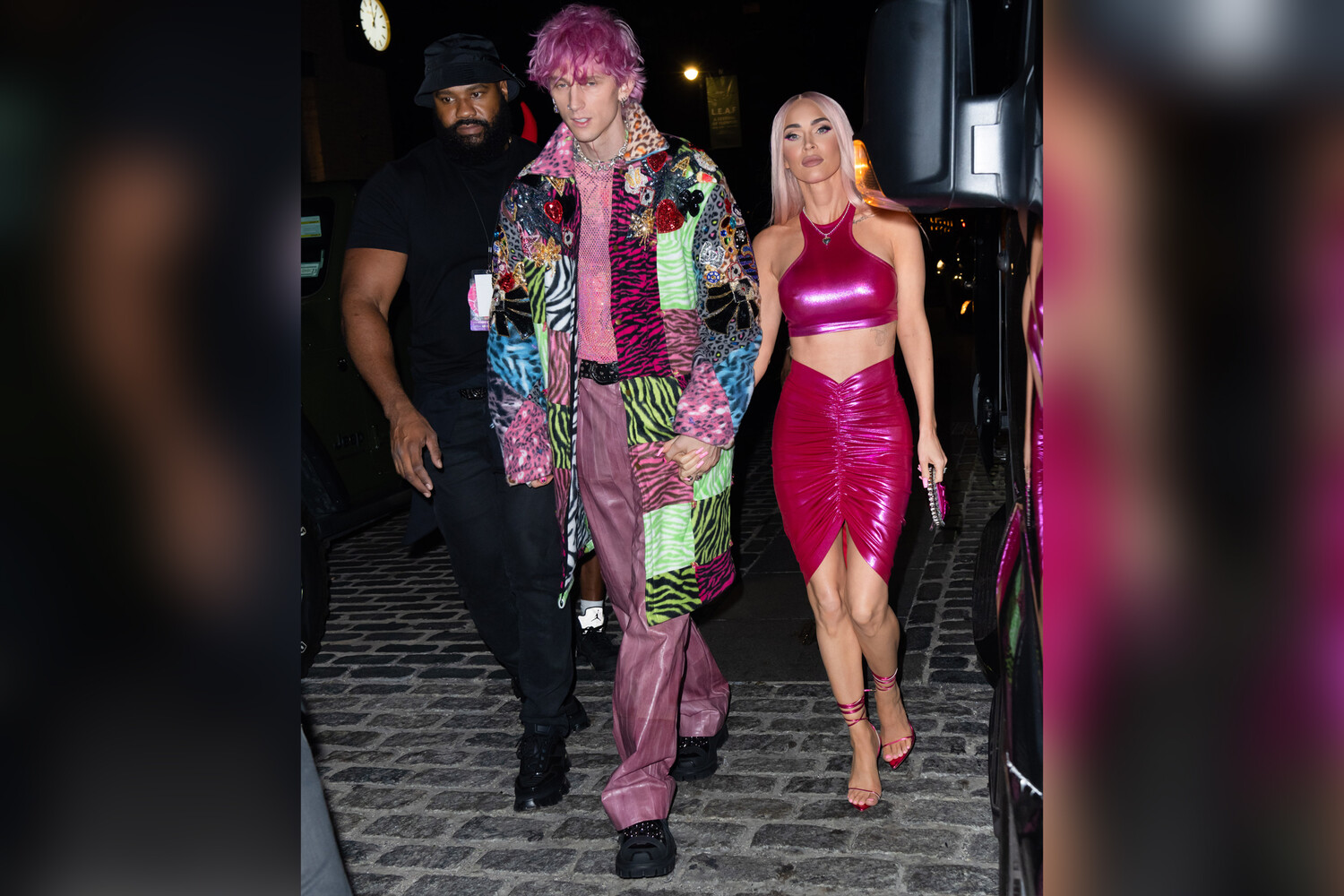 Меган Фокс поддержала своего жениха, рэпера Machine Gun Kelly, во время его концерта в арене Madison Square Garden в Нью-Йорке. Актриса была одета в костюм цвета фуксии, состоящий из укороченного топа и мини-юбки с драпировками. Блестящий комплект из латекса звезда надела без нижнего белья, дополнив его босоножками на шпильке с завязками и микросумкой со стразами.