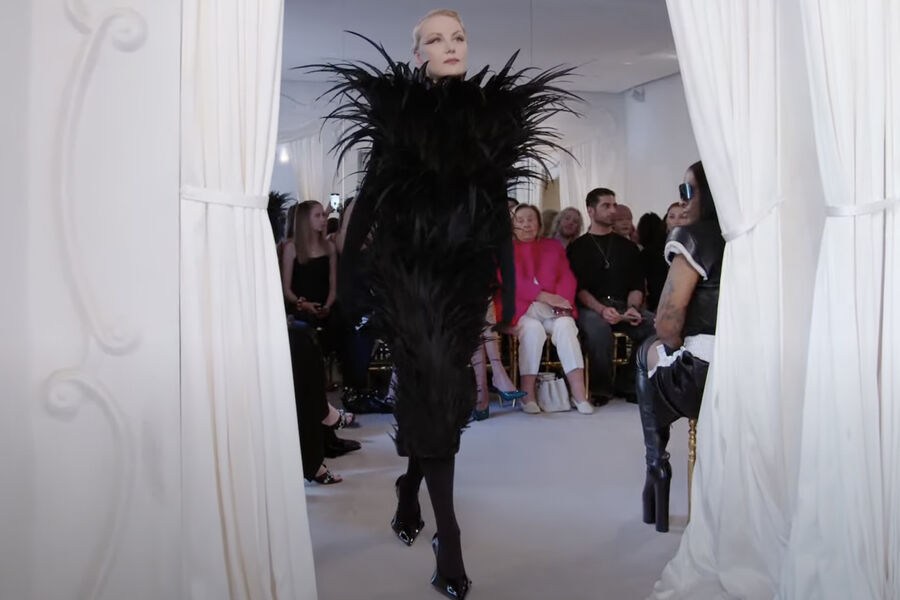 Российская актриса и сценаристка прошлась по подиуму в черном платье с перьями. Наряды из кутюрной коллекции Balenciaga продемонстрировали также мировые звезды первой величины – Ким Кардашьян, Николь Кидман, Белла Хадид, Дуа Липа и Наоми Кемпбэлл.
