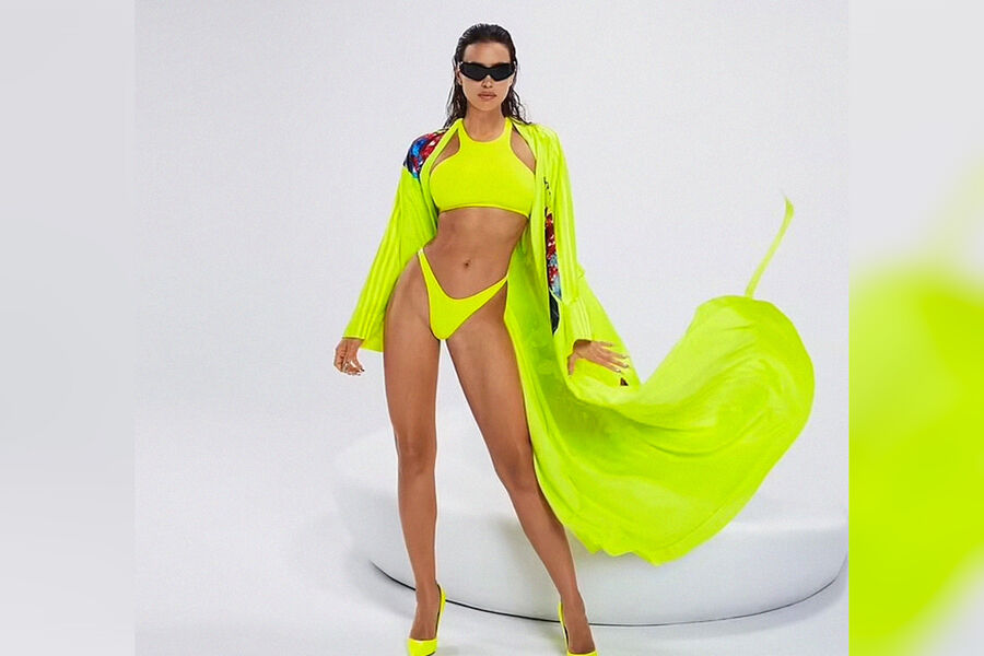 36-летняя модель российского происхождения примерила несколько образов из новой пляжной коллекции Ivytopia, созданной певицей Бейонсе в сотрудничестве с брендом Adidas. Cамым ярким из пляжных образов стал неоново-салатовый: спортивный топ, высокие трусы-стринги и туника дополнены лодочками на шпильке такого же цвета.