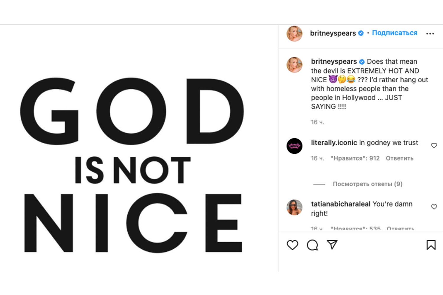 На днях Бритни Спирс опубликовала в Instagram (компания-владелец Meta признана экстремистской организацией) баннер со словами «Бог не мил» и добавила в подписи: «Значит ли это, что дьявол хорош и мил? Я лучше буду общаться с бездомными, чем с людьми в Голливуде... К вашему сведению».
