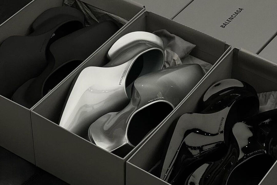 Креативный директор бренда Демна Гвасалия представил модель кроссовок вытянутой формы, с квадратным мысом и массивной подошвой. Они доступны в трех вариантах: матовом и глянцевом черном, а также металлическом.