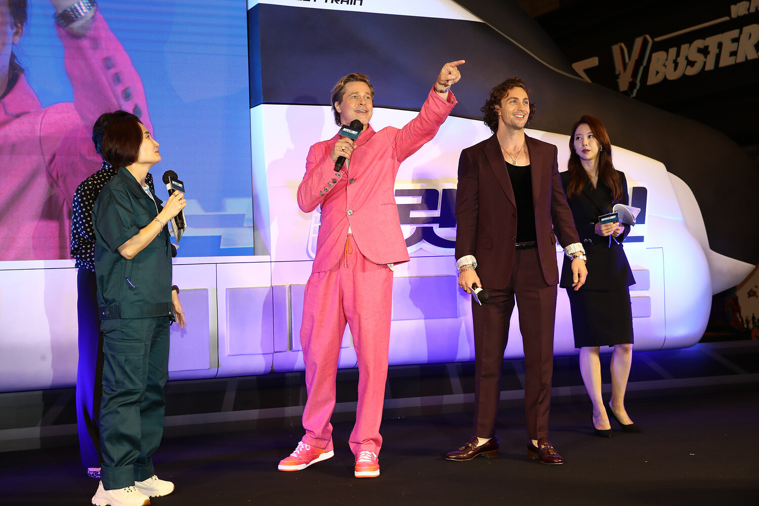 Брэд Питт пришел на премьеру своего нового фильма «Быстрее пули» в Сеуле в ярко-розовом костюме и кроссовках в цвет. Фотографии с красной дорожки появились на People.