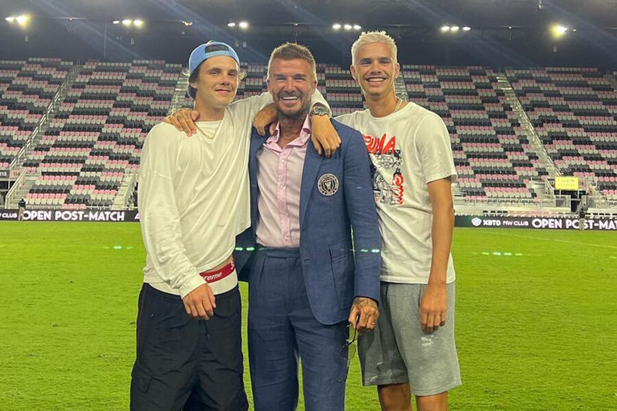 Футболист Дэвид Бекхэм опубликовал фото с 17-летним Крузом Бекхэмом и 19-летним Ромео Бекхэмом на футбольном поле. Снимками он поделился в социальных сетях.