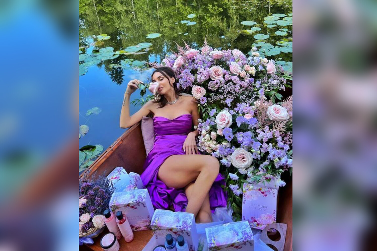 На снимках Оксана Самойлова позирует в фиолетовом платье-бюстье с разрезом до бедра. Специально для съемки она легла в лодку, которую усыпали живыми цветами. Съемка проходила на болоте в лесу.