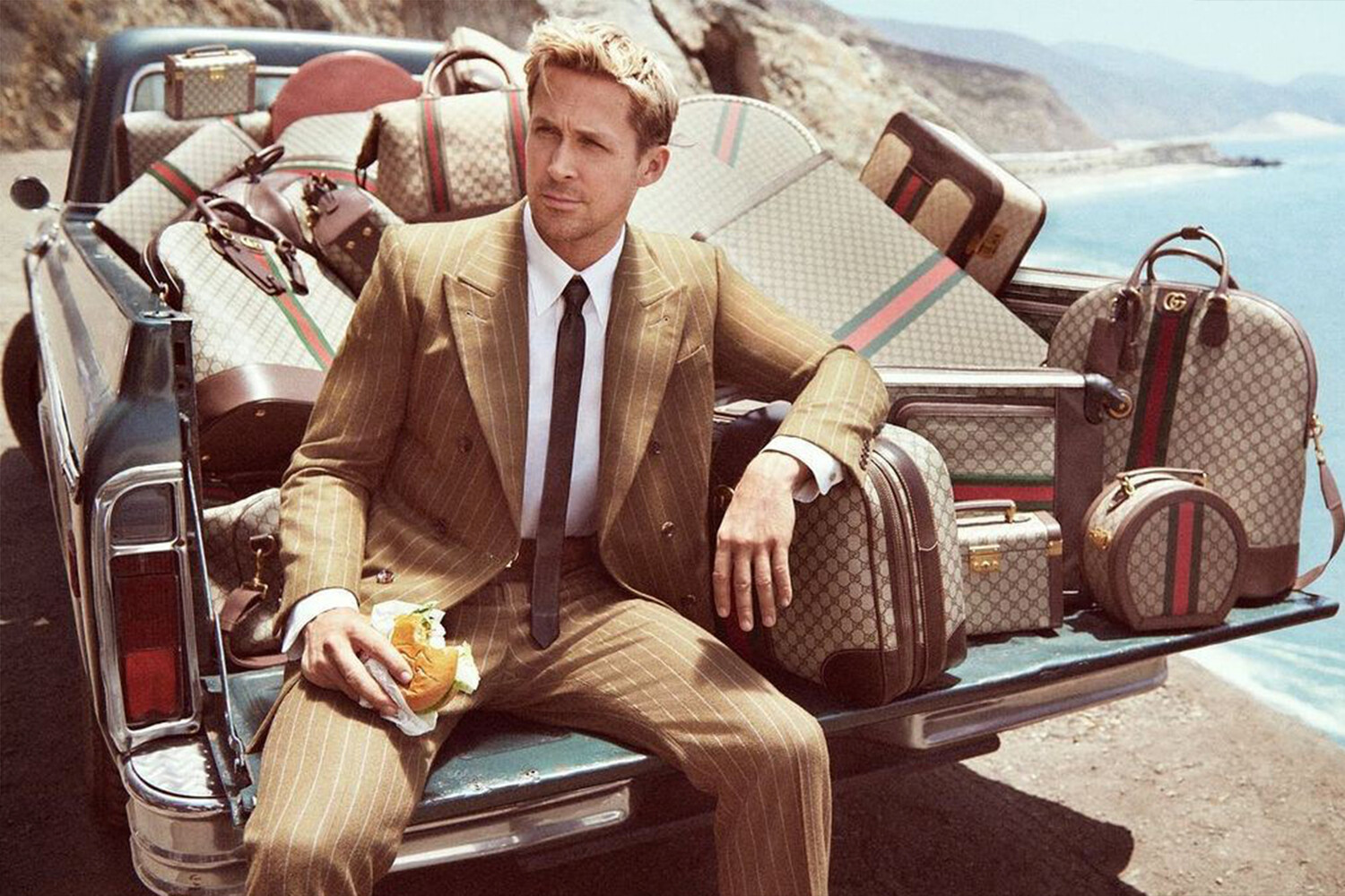 На одном снимке он толкает тележку с багажом Gucci в стиле The Darjeeling Limited, одетый в костюм в стиле 70-х годов, а на другом — в гавайской рубашке из коллекции Gucci весна 2022 в окружении чемоданов и ручных сумок с монограммами GG. На других фотографиях Райана Гослинга можно увидеть сидящим на заднем сиденье машине в полосатом костюме и галстуке в стиле ретро.