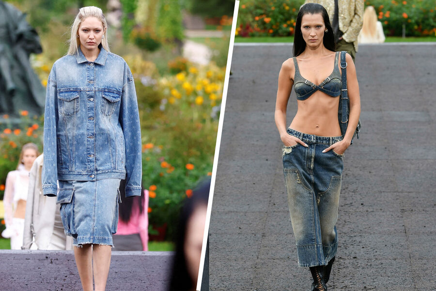 В воскресенье, 2 октября, сестры-супермодели появились на подиуме французского модного дома в джинсовых нарядах. Белла Хадид вышла на шоу в юбке-миди с низкой талией и бюстгальтере из темной ткани, а ее сестра Джиджи в куртке фасона оверсайз и юбке-миди с накладными карманами. Наряды моделей были дополнены сапогами на высоком каблуке с шнуровкой впереди.