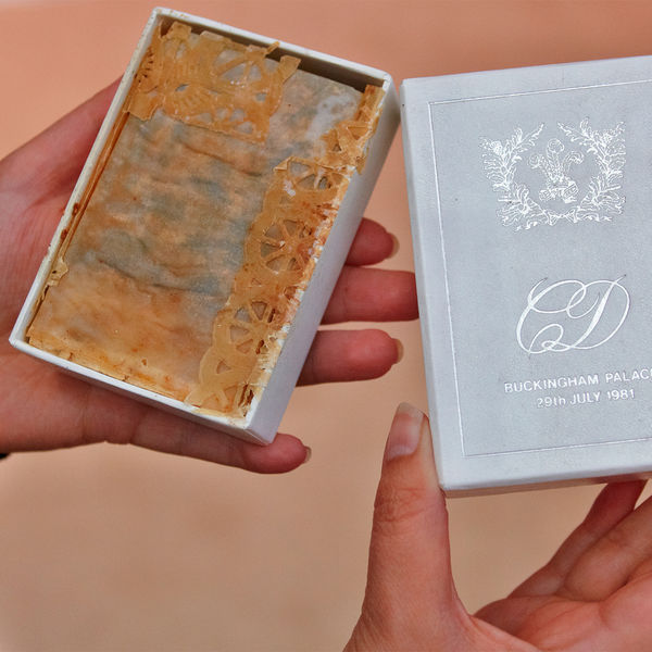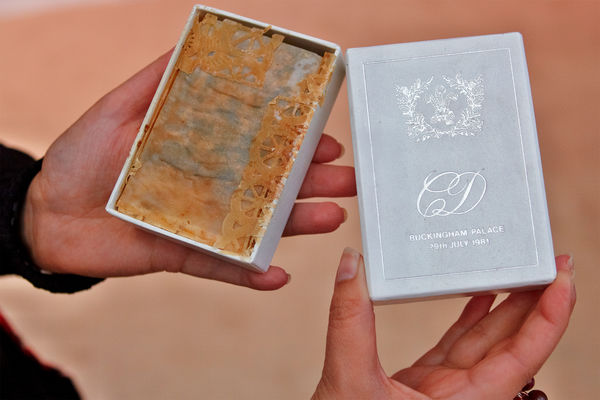 Для свадьбы Карла III и принцессы Дианы было изготовлено 23 официальных торта. Этот кусок скорее всего был взят из центрального фруктового торта, который состоял из 5 ярусов. В 2014 году кусочек такого же торта был продан за $1 375.