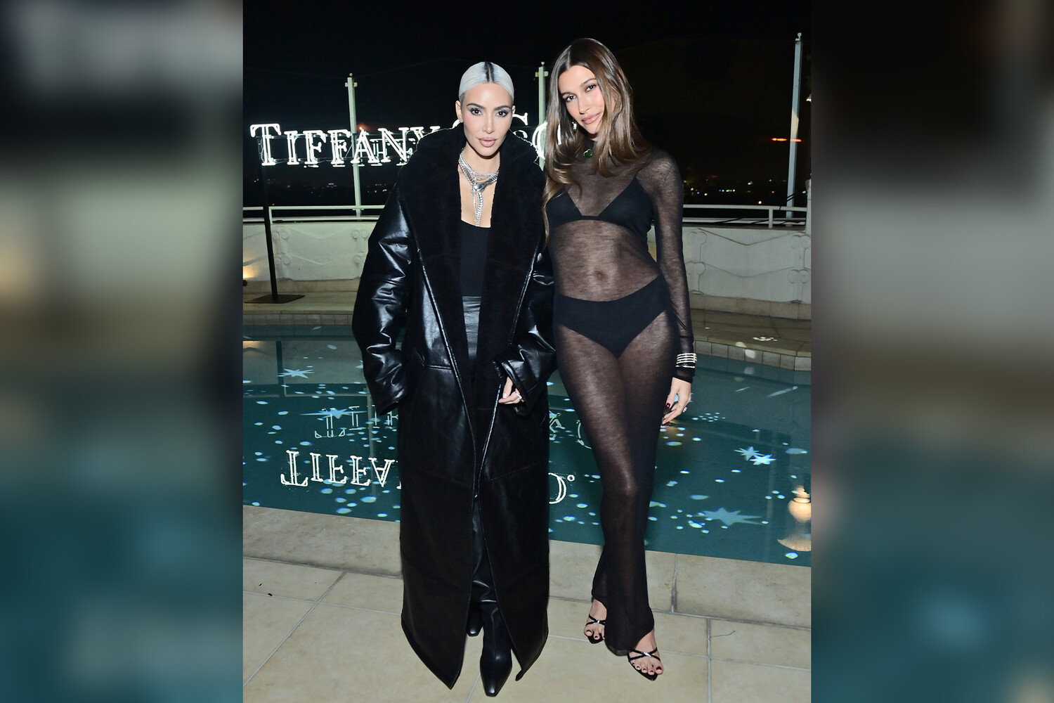 Ким Кардашьян пришла на мероприятие Tiffany&Co в черных кожаных брюках, длинном пальто с искусственным мехом внутри и серебряном ожерелье. Хейли Бибер для светской вечеринки выбрала прозрачное платье в сетку, под которое надела черное белье.
