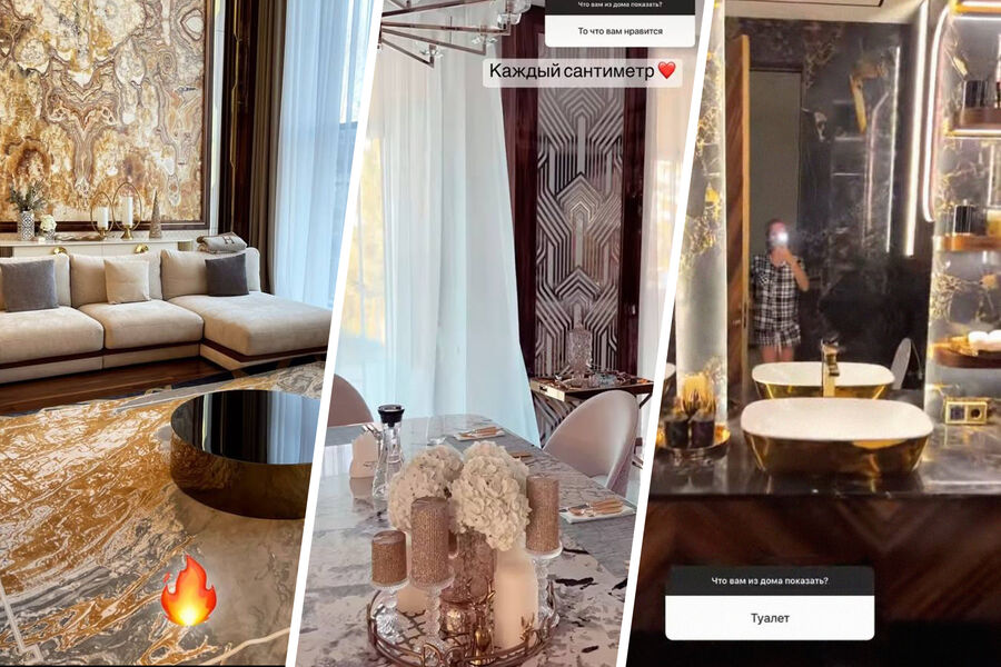 На фотографиях певица показала интерьер гостиной с золотым и мраморным декором, туалет с зеркалами и отделкой из темного дерева и зону кухни с панорамными окнами.
