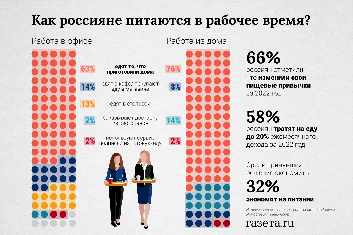 «Чаще всего офисные работники едят самостоятельно приготовленную дома еду – таких 63%», — сообщили авторы исследования.