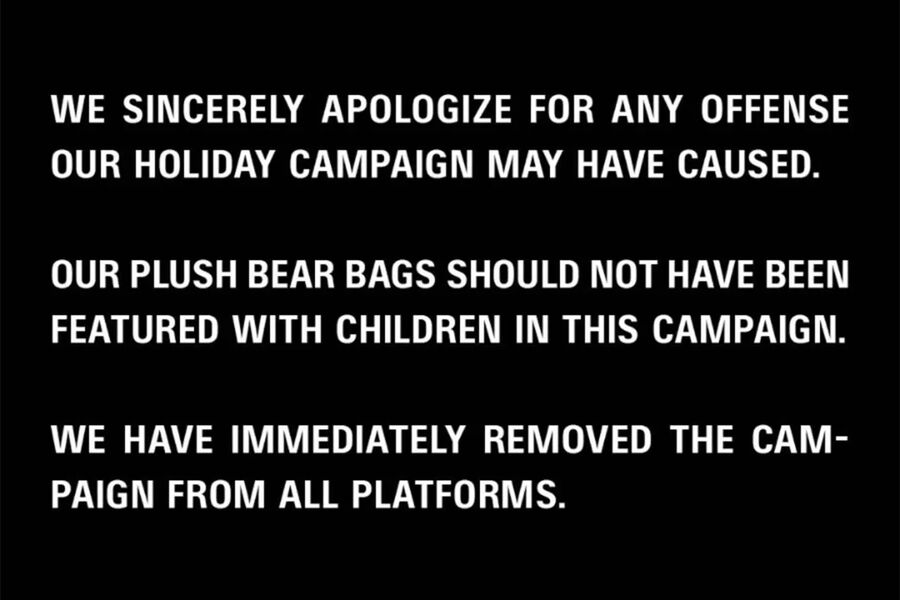 «Мы искренне просим прощения за то оскорбление, которое нанесла наша праздничная кампания. Наши сумки в виде плюшевых медвежат не должны быть отрекламированы с участием детей. Мы немедленно удалили фотографии из кампании со всех платформ», — заявил бренд.